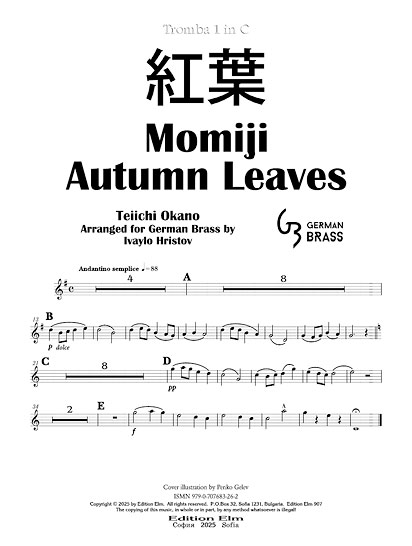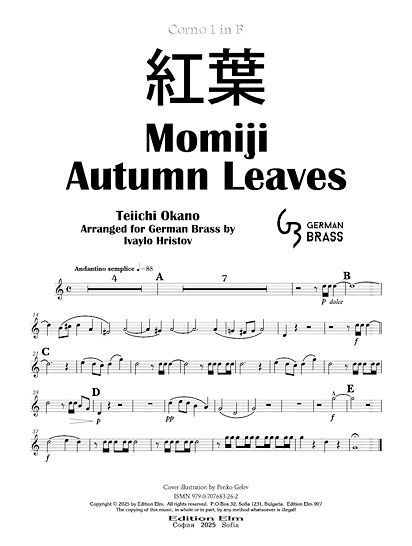 Teiichi Okano – Momiji – Folhas de outono Arreglada para German Brass por Ivaylo Hristov. Para 4 trompetes em Dó, 2 trompas em Fá, 2 trombones, trombone baixo, tuba e triangolo (opcional). A bela canção infantil japonesa Momiji, ou Folhas de outono, de Teiichi Okano, inspirou o arranjador, que foi convidado pela German Brass para preparar um encore para a sua digressão no Japão. Esta adorável melodia foi adornada com o som requintado do ensemble de metais, para completo deleite tanto dos músicos como do público. 2' 34" ISMN 979-0-707683-26-2 | |