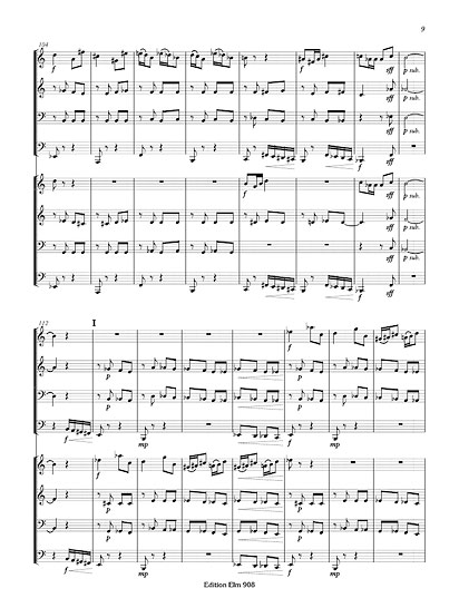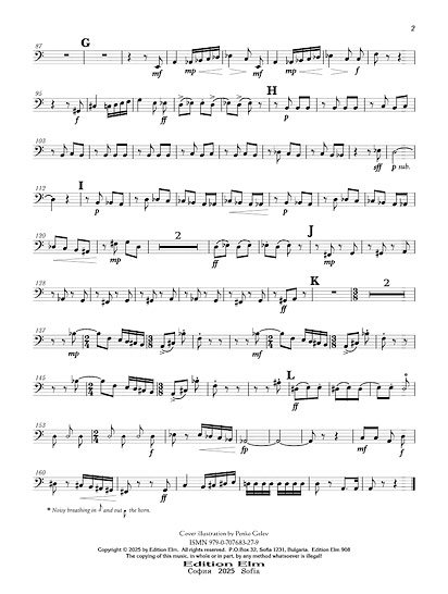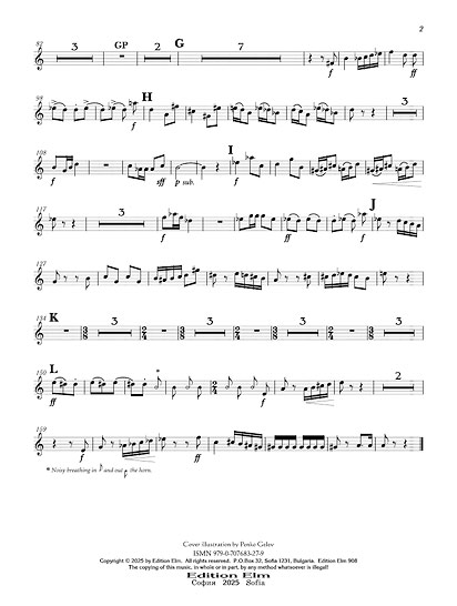 Robert Aldridge – Tango para Gabriela Arranjo para violino solo e ensemble de metais por Ivaylo Hristov. Para 3 trompetes em Si bemol, 2 trompas em Fá, trombone, trombone baixo, tuba e violino solo. O violinista eslovaco Boris Kucharsky encomendou ao compositor norte-americano Robert Aldridge uma peça de encore para violino solo e orquestra de cordas — Tango para uma bela mulher, inspirada em Gabriela Skrabakova. Publicamos aqui uma transcrição para violino solo e ensemble de metais, onde os instrumentos de metal devem tocar o tempo todo em quase pizzicato. 2' 40" ISMN 979-0-707683-10-1 | |