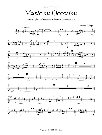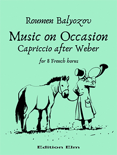 Roumen Balyozov – Música ocasionalmente – Capricho segundo Weber Para 8 trompas em Fá. O manuscrito de Música ocasionalmente para Octeto de Trompas tem a data de 28 de dezembro de 1986 e foi apresentado pela primeira vez no ano seguinte. O subtítulo Cariccio segundo Weber, diz tudo: o famoso Coro dos Caçadores da ópera Der Freischütz, tão conhecido entre os trompistas, é reescrito de uma forma tão invulgar e inexplicável, tão típica da personalidade bem-humorada do compositor. 2' 56" ISMN 979-0-707683-27-9 |